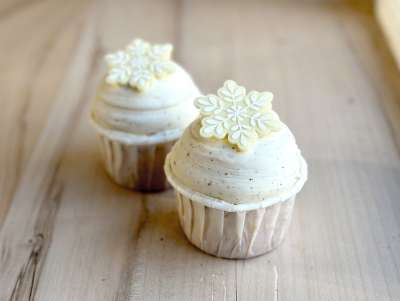 Notre Cupcake Boule de Neige est 100% Vanille : biscuit moelleux à la vanille de Madagascar, insert vanille, généreuse ganache montée à la vanille... Et l'exception qui confirme la règle de la bataille : le flocon est au chocolat blanc.